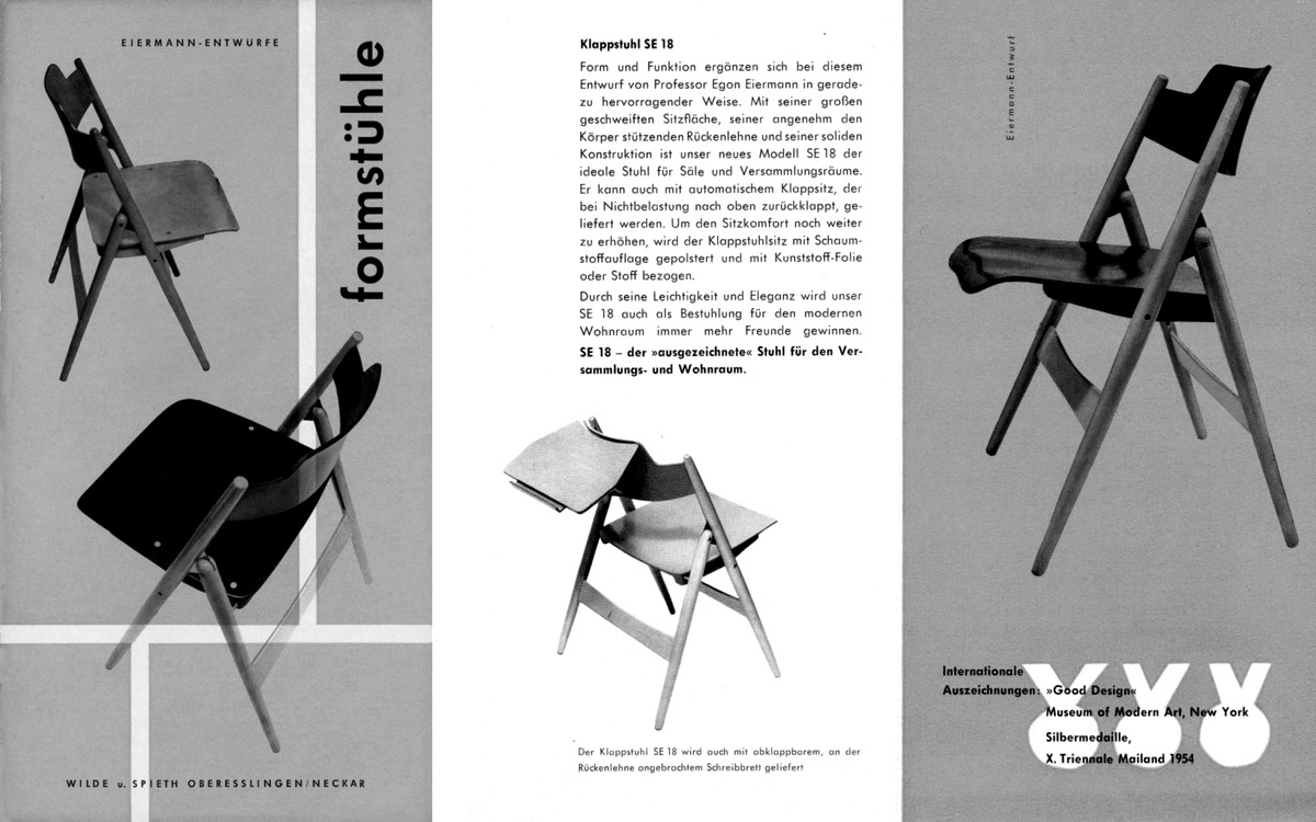 Ein Volltreffer! Schnell wurde der Klappstuhl SE18 weltweit bekannt, denn er traf eine Marktlücke. Es gab in den 1950ern keinen Stuhl für die in Deutschland neu gebauten Stadthallen und Gemeinschaftshäuser. Der praktische Klappstuhl folgte mit seinem Rundholzgestell und der organischen Ausbildung von Sitz- und Rückenlehne einem Formenideal, wie es sich vorher besonders in Dänemark ausgebildet hatte. Wie bei anderen Modellen von Egon Eiermann liegt auch hier die Leistung in der gelungen Umsetzung von Technik und einer als ganz selbstverständlich erscheinenden Formgebung. Offenheit der Konstruktion und Materialökonomie, jene Prinzipien, die Neofunktionalisten wie er aus dem Katechismus der klassischen Moderne übernahmen, waren die eine Seite der Medaille. Eine lebendige, Spannung erzeugende Linienführung, die andere Seite. Jedes Detail ist für sich durchgestaltet. Billig, 1953 kostete der Stuhl keine 25,00 DM, leicht und leise zusammenklappbar, wegstellbar und trotzdem wohnlich. In „Wartestellung“ verlangt er ein Minimum an Stauraum, tatsächlich benötigen 40 Stühle nur 1,5 qm Stellfläche. Später experimentierte Eiermann auch mit Kunststofflehnen und Stahlrohrgestellen.
